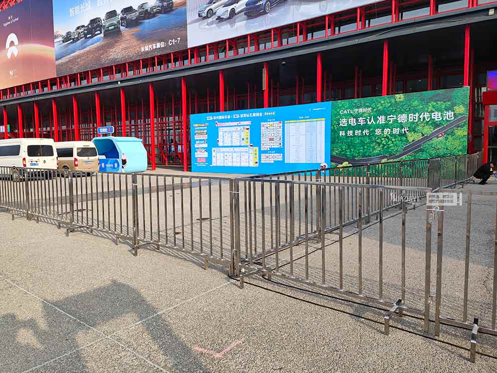 鄭州鐵馬出租公司推出新款鐵馬—方管不銹鋼材質。鄭州華熠鐵馬護欄出租公司助力會展中心活動現場,我們的護欄已經布置到位,今天使用的這款護欄是方管不銹鋼材質的,在太陽的照射下發出耀眼的光芒,為現場的區域劃分提供了更加優質的選擇,更具條理和規范性。