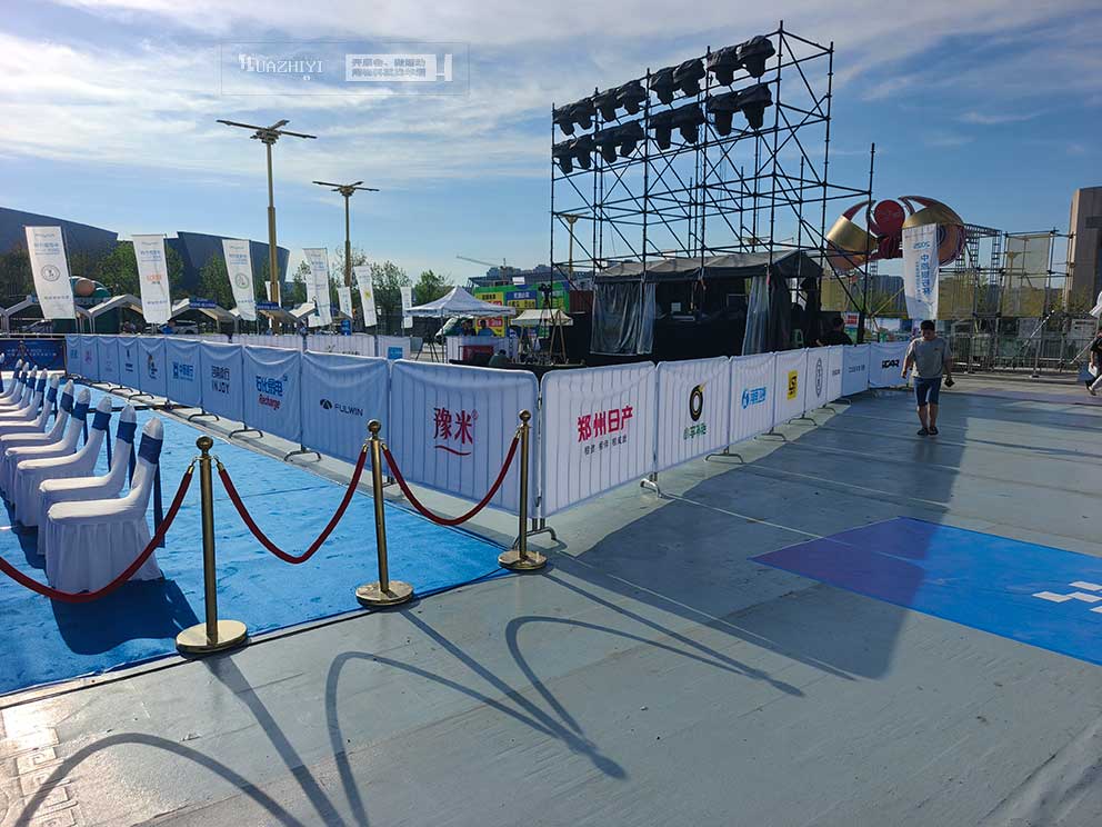 不銹鋼鐵馬護欄在場地中率先就位,它們以硬朗的身姿劃分出不同功能區域。每段 1.5 米長的鐵馬整齊排列,相互間用牢固的連接件緊密咬合,形成堅不可摧的屏障。為契合賽事主題與宣傳需求,鐵馬護欄外包裹著白色底色的廣告布,品牌名稱以醒目的字體印于其上,在日光下清晰可見,既起到隔離防護作用,又成為流動的廣告載體。
